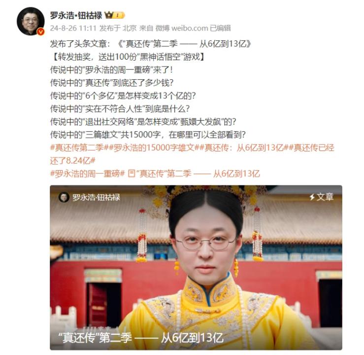 2024年8月26日,罗永浩发文称,到目前为止,“真还传”一共还了8.24亿元,远远超出之前对外公布过的“欠债6个多亿元”。