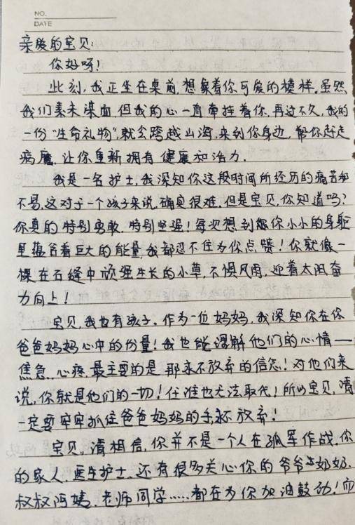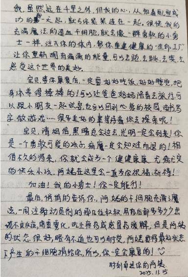 在写给患儿的信中,她充满柔情地写道:“宝贝,阿姨的干细胞充满魔法……叔叔们注射后都出现了不良反应,但阿姨的状态很好,略有不适但也可以耐受。阿姨要将最好状态下产生的干细胞捐给你,你一定会康复的!”在采集前夕写的这封永远无法寄出的信,字里行间,充满了母亲般的慈爱与鼓励。“你就像一棵在石缝中顽强生长的小草,不惧风雨,迎着太阳奋力向上!”她称赞孩子的坚强,并告诉他:“很快,我的充满魔法的造血干细胞,就会像一群勇敢的小勇士一样,注入你的体内,帮你重建健康的‘生命工厂’。”这不仅仅是一次细胞的移植,更是一次生命的鼓舞和爱的传递。她鼓励孩子康复后去奔跑、去学习、去探索世界的美好,坚信“黑暗总会过去,光明一定会到来!”