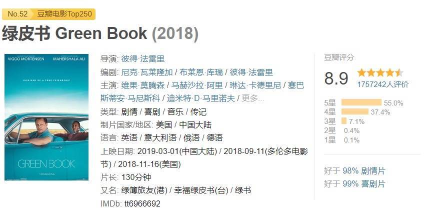此片取材于真实故事,全剧以“绿皮书”为引,展现了白人与黑人的不同人种、底层与精英的不同阶级,肤色和文化修养上的反差,在旅途上自然产生一些奇妙的化学反应 。