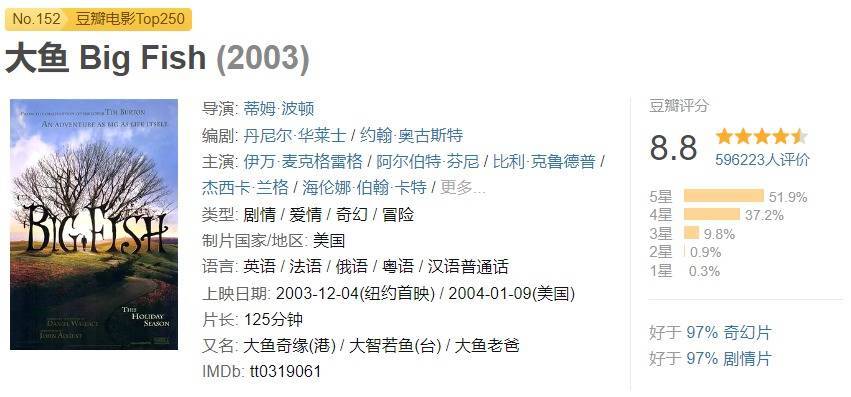 一部温情哥特风的成人童话,光怪陆离,天马行空。传说中没人能钓上的大鱼,连体同身姐妹花,时隐时现的美人鱼,房子一样高的巨人,欣欣向荣又一夜败落的“丰都”诡镇,晚上变狼人的马戏团长,一只眼珠可以预见死亡的女巫……