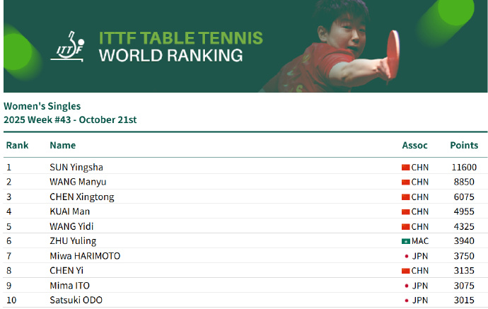 配资头条官网 乒联排名:孙颖莎连续171周排名第一 国乒包揽女单前五 配资头条官网 来源:元鼎证券官网入口 网站:元鼎证券_元鼎证券app官方免费下载_配资盈利网 日期:2025-11-13 04:50:18 查看:169